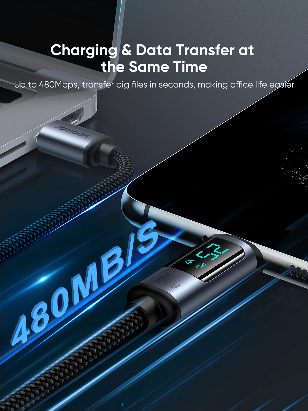 - Écran LED transparent : La prise du câble Joyroom est équipée d’un écran LED transparent qui vous permet de suivre les paramètres de charge de votre iPhone.